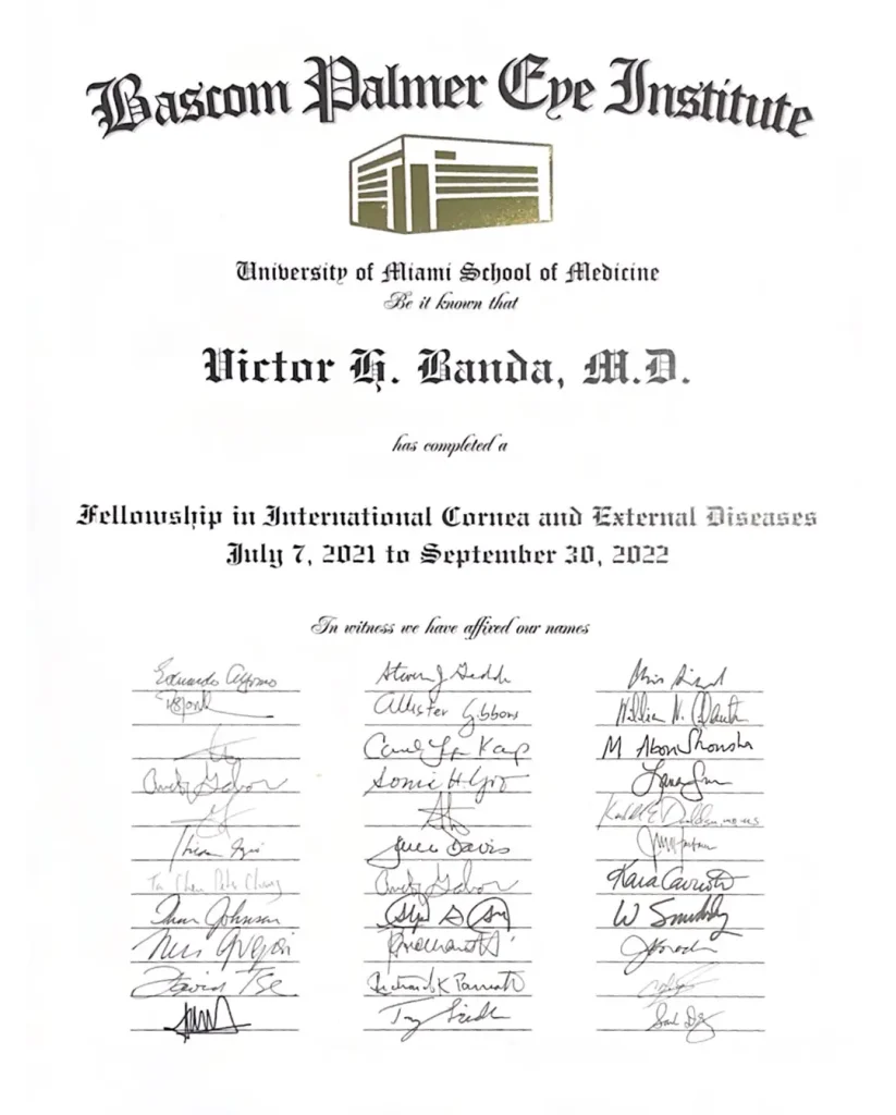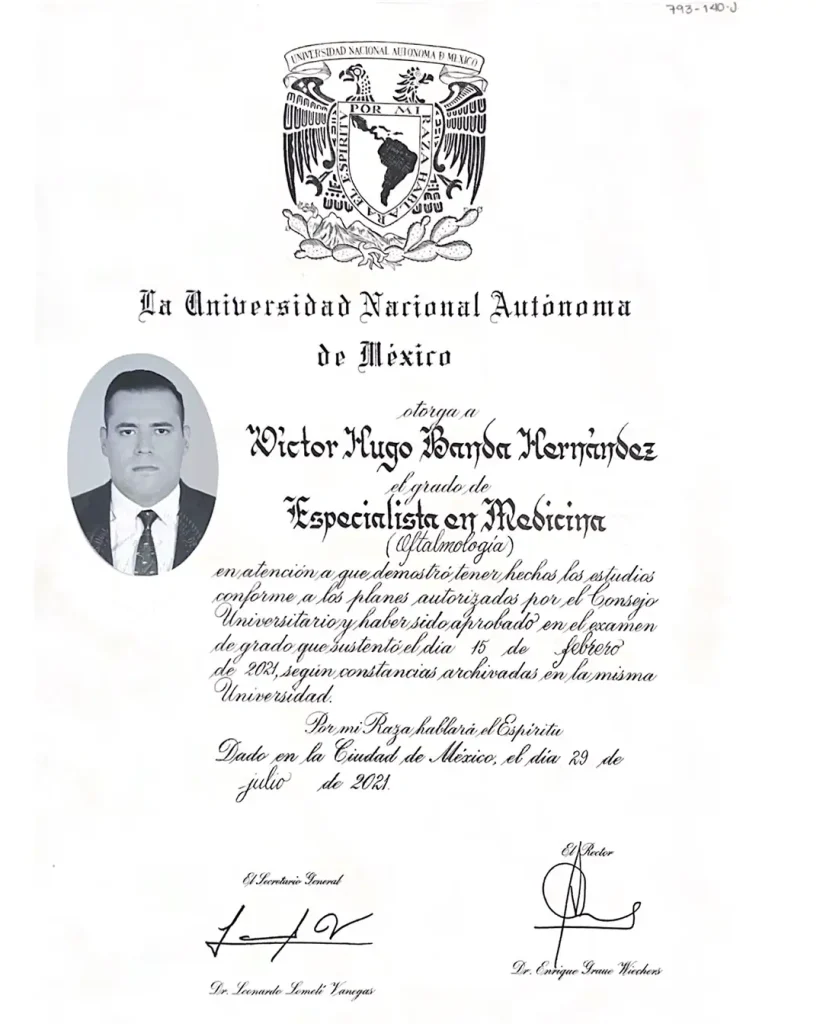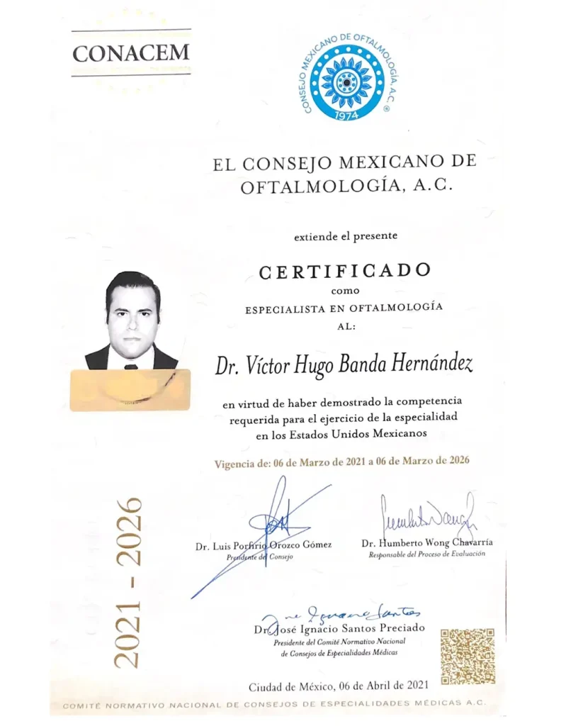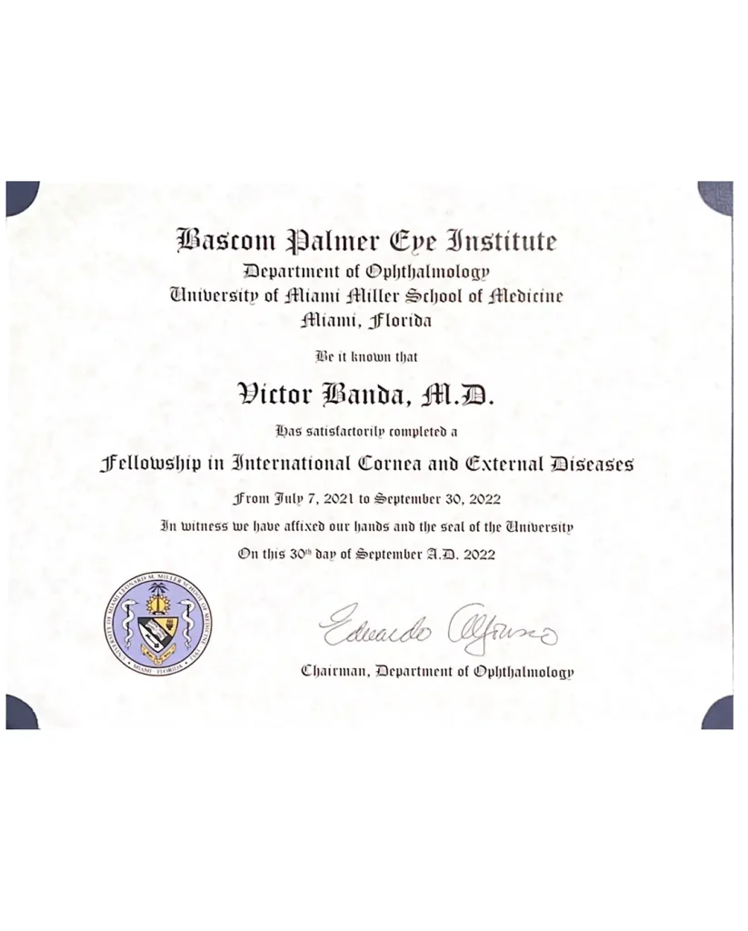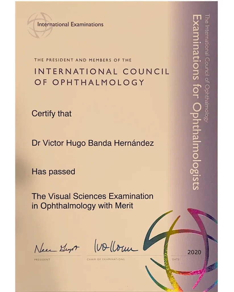 Cirujano Oftalmólogo certificado por el Consejo Mexicano de Oftalmología, con subespecialidad en Cornea y Superficie Ocular en uno de los hospitales más prestigiosos a nivel mundial rankeado #1 en los Estados Unidos año con año desde hace mas de 2 décadas, el Bascom Palmer Eye Institute en la ciudad de Miami, Florida.
